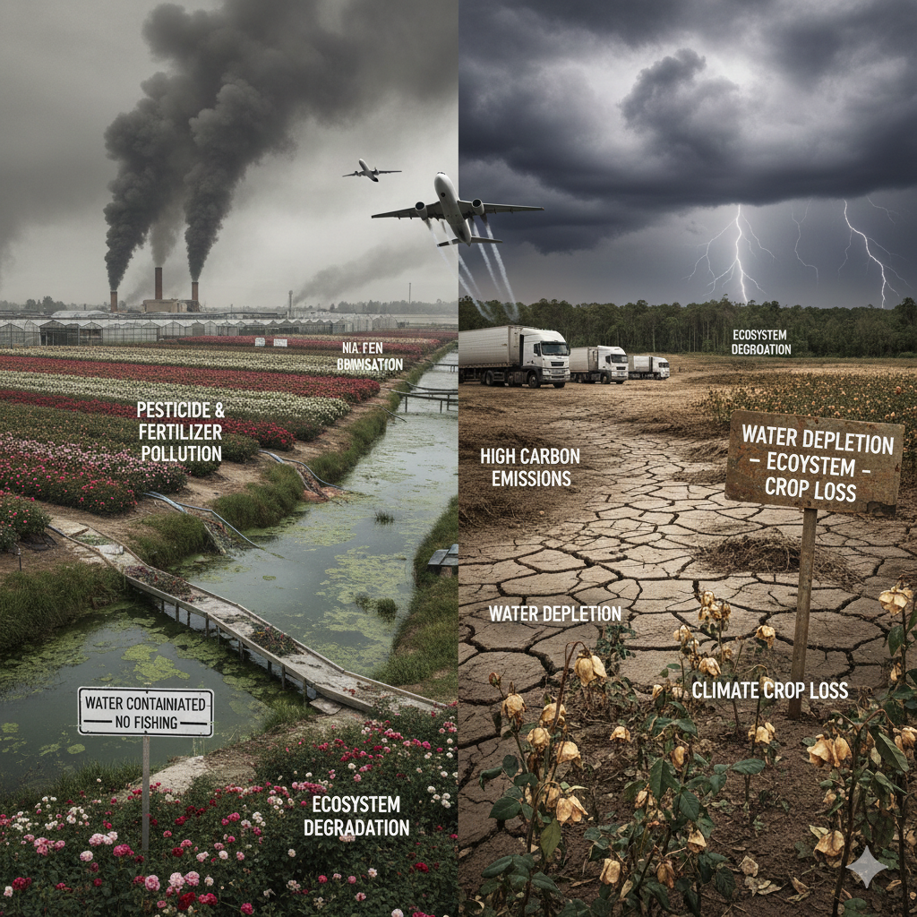 Large-scale commercial flower farms, especially in major exporting countries, consume immense volumes of freshwater, often in regions already suffering from drought or limited resources. This overuse contributes to water depletion, pollution, and the long-term degradation of surrounding ecosystems.