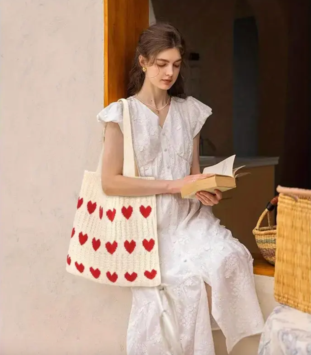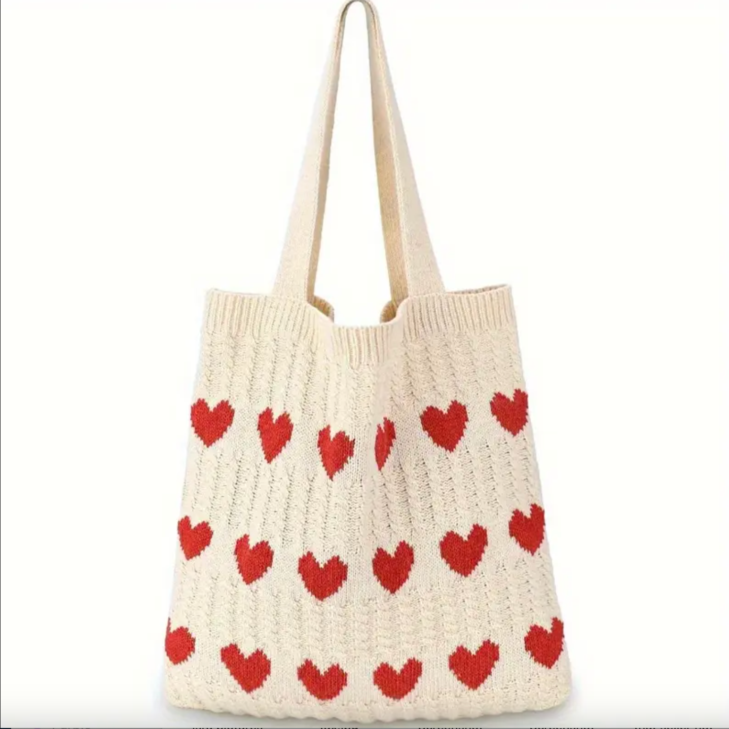 Featuring a cozy cream base with bold red hearts, this crochet shoulder bag is perfect for daily errands, shopping, or gifting. Made with soft yarn and a strong knit structure, it’s lightweight, reusable, and built to last — a sustainable alternative to plastic and fast fashion.
