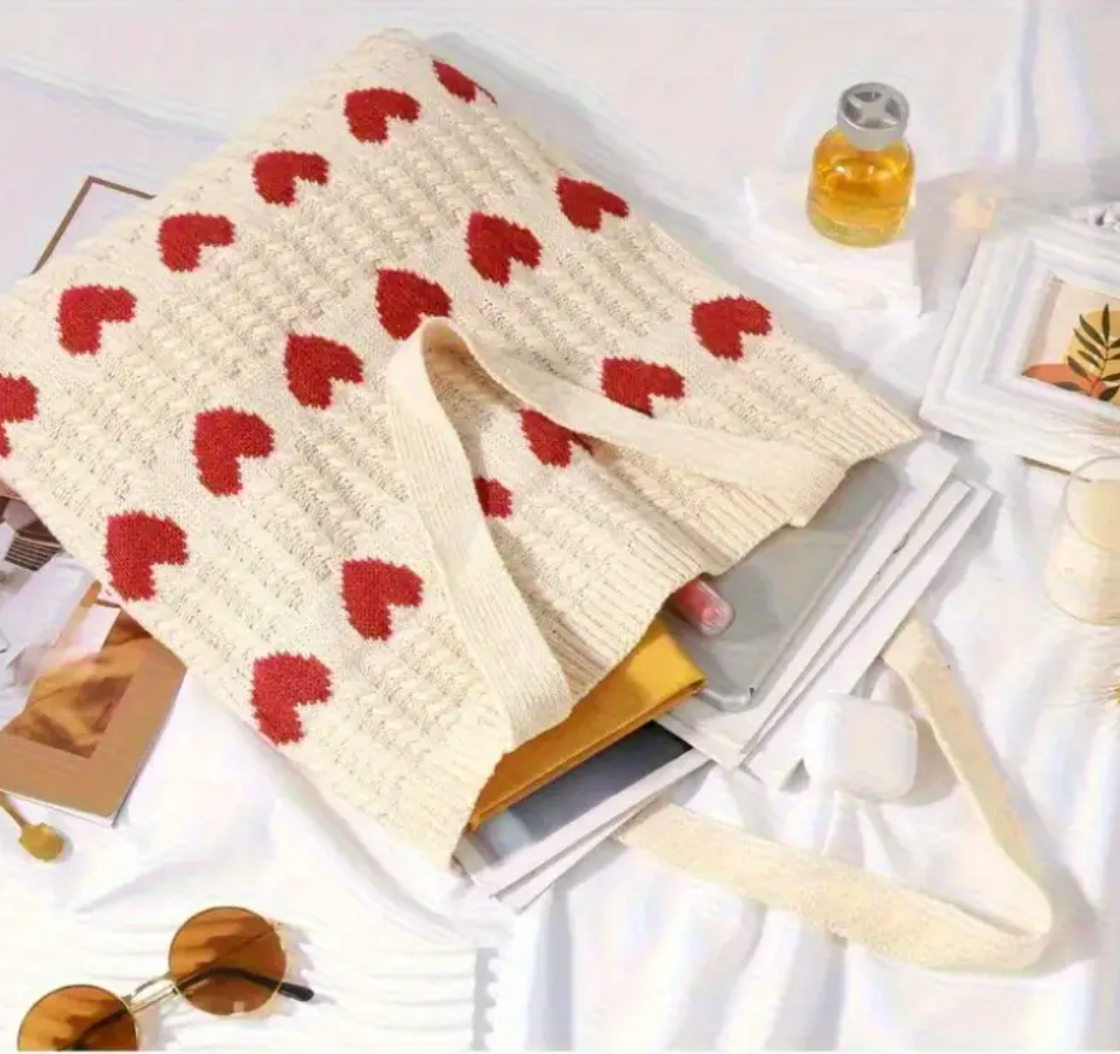 Handmade Crochet Tote Bag with Red Hearts – Reusable & Stylish Shoulder Bag